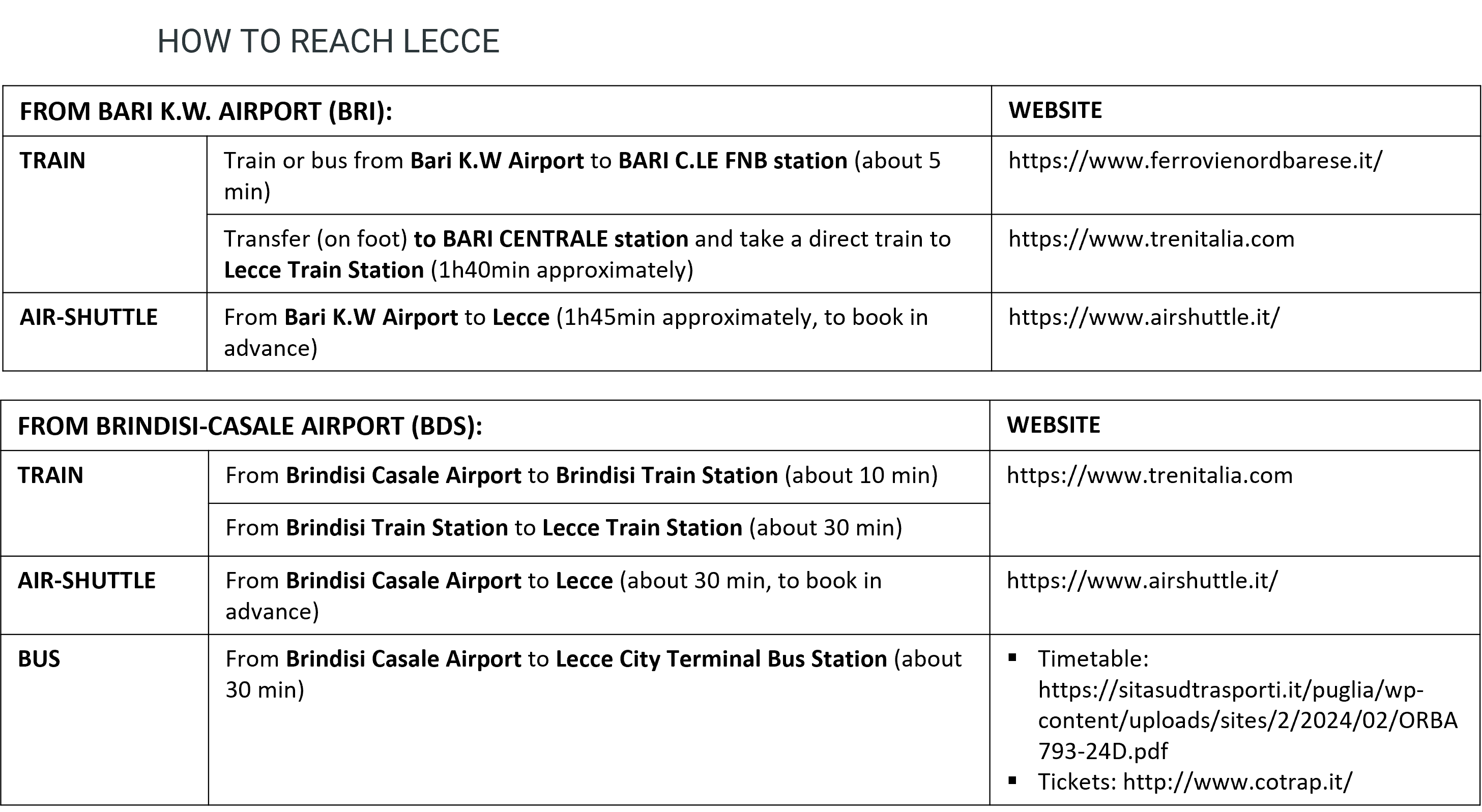 The closest airport is Brindisi “Papola-Casale” Airport (BDS), about 40 km from Lecce.